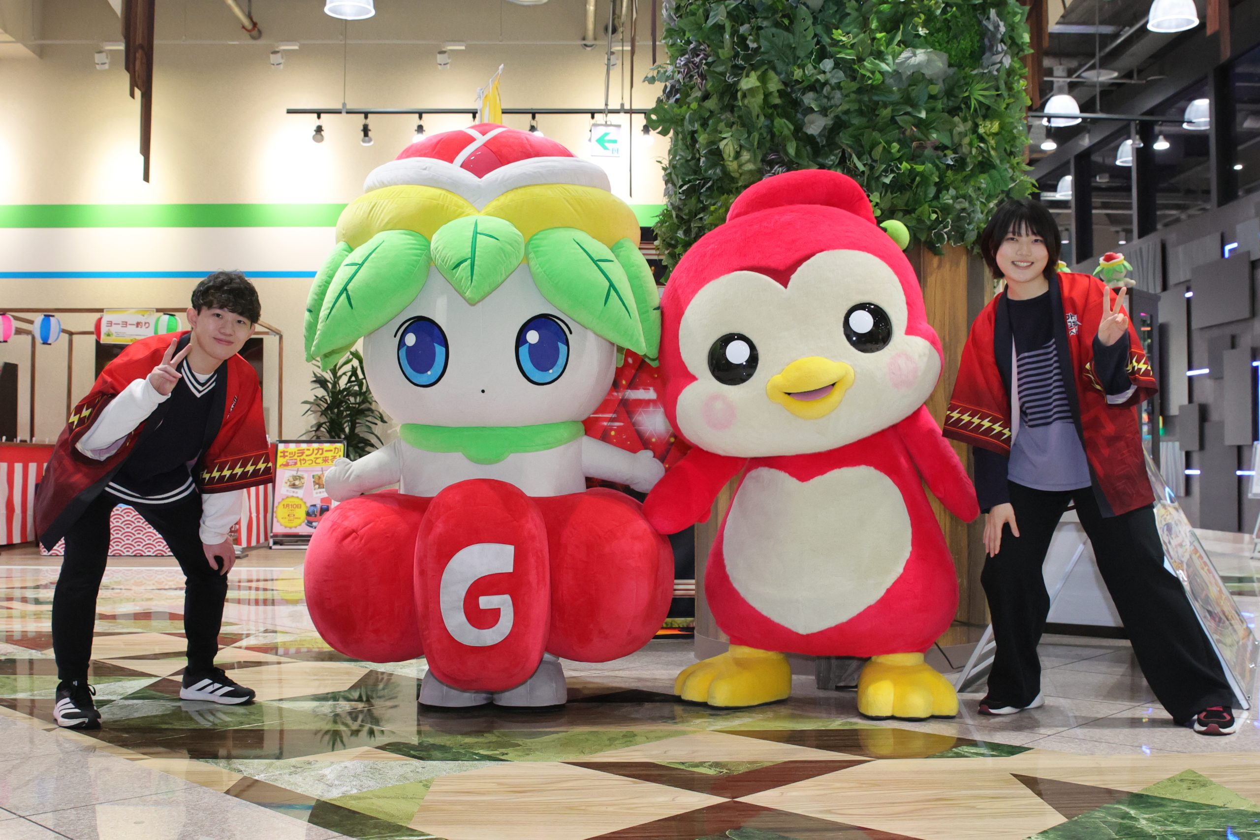 当日は、遊楽の公式キャラクター「にわぞぅ」と、ニューギンのキャラクター「ギンちゃん」によるキャラクターグリーティングを実施しました。