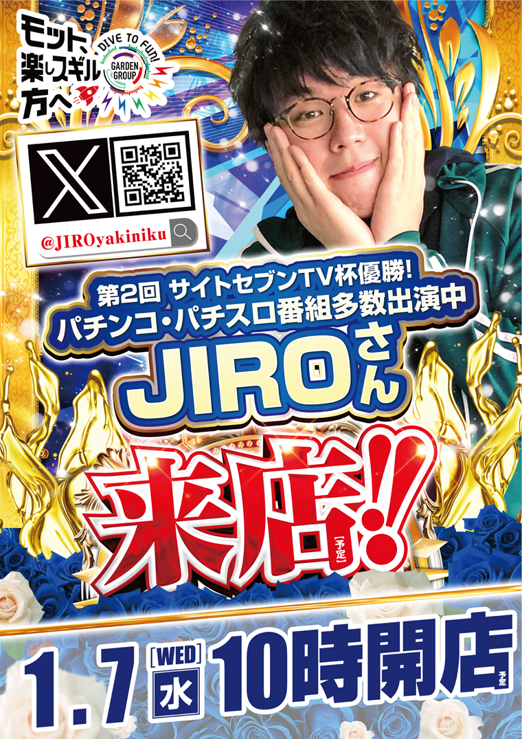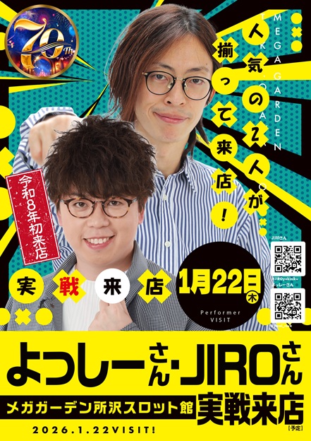 2026-01-22 【メガガーデン所沢スロット館】令和8年1/22(木)W来店!よっしーさん・JIROさん来店! 【メガガーデン所沢スロット館】令和8年1/22(木)W来店!よっしーさん・JIROさん来店! 2026年 1月 22日 【メガガーデン所沢スロット館】令和8年1/22(木)W来店!よっしーさん・JIROさん来店!